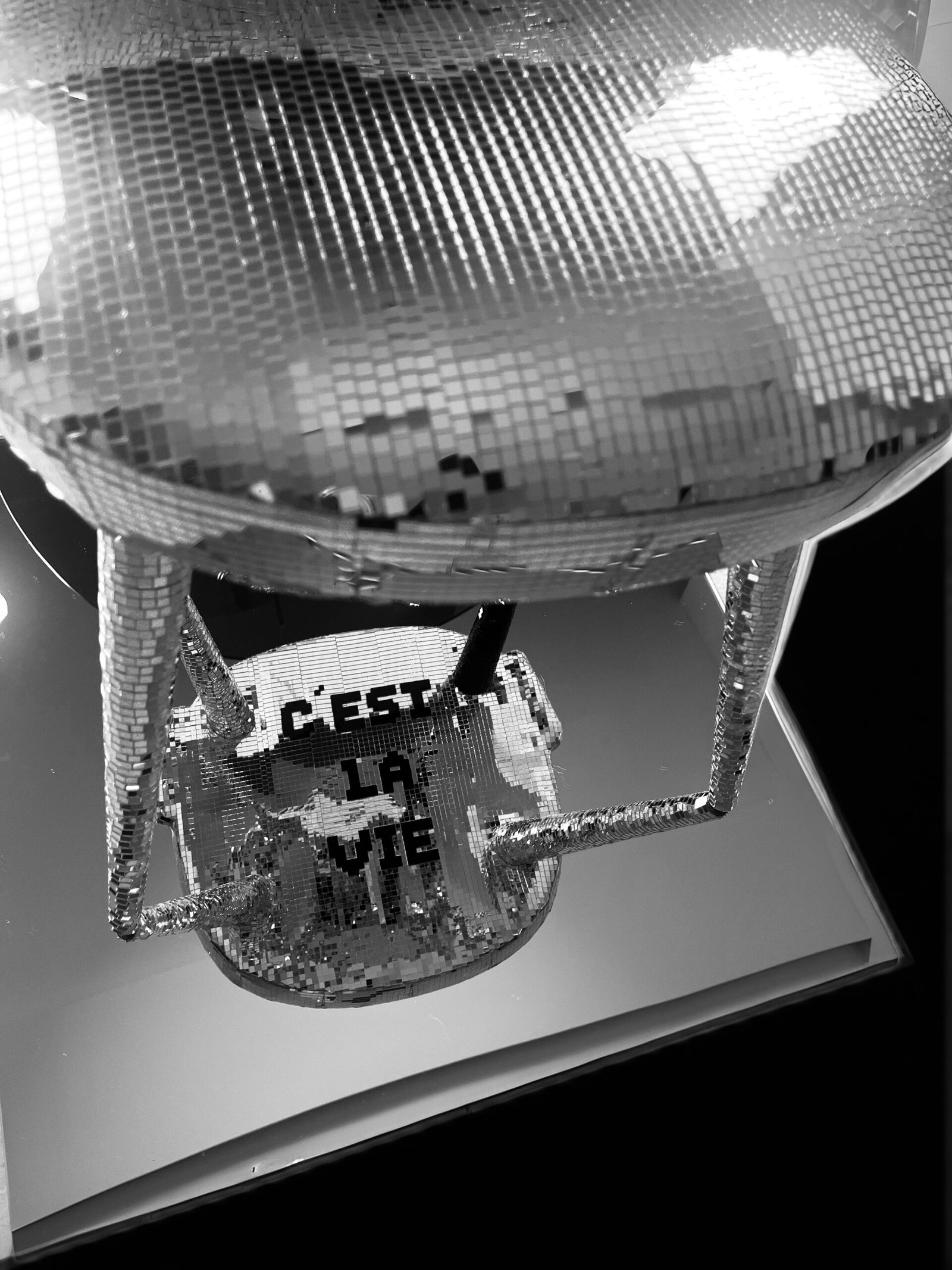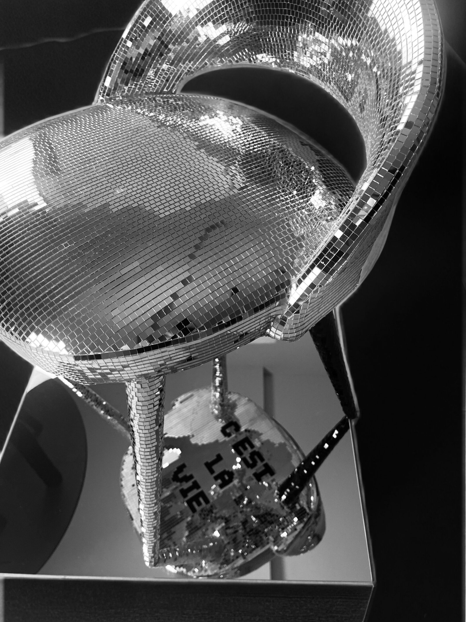 Cette pièce unique transforme un objet familier en œuvre d’art décorative étincelante. Sous la chaise, un message caché en français se révèle : « C’EST LA VIE ». Munissez-vous de votre plus beau miroir pour découvrir l’inscription et vous rappeler que la vie comporte à la fois des bons et des mauvais moments. Une invitation à accepter l’imperfection, à garder espoir et à célébrer la résilience.